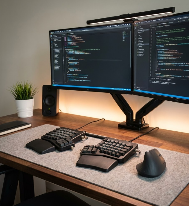 - 분리형 키보드의 도입: 어깨가 안으로 말리는 '라운드 숄더'가 심하다면, 좌우가 분리된 키보드(Split Keyboard)를 고려해 보세요. 가슴을 편 상태로 타이핑할 수 있어 상체 통증을 획기적으로 줄여줍니다.