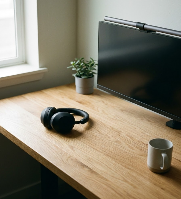 - 모니터 조명(스크린 바) 활용: 천장 불빛이 모니터에 반사되어 눈이 부시다면 모니터 상단에 거는 '스크린 바'를 고려해 보세요. 화면 반사를 줄이면서 내 키보드 영역만 적절한 밝기로 비춰주어 시각적 대비를 편안하게 만들어줍니다.