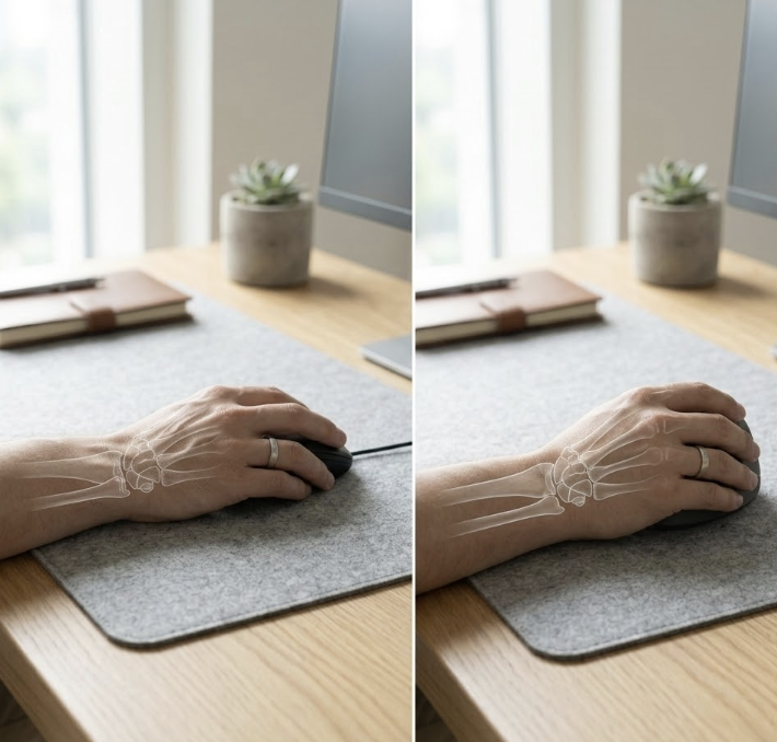 - 원리: 일반 마우스는 요골과 척골(팔뚝 뼈)이 꼬인 상태로 작업하게 만들지만, 버티컬 마우스는 마치 악수하듯 손을 세우게 하여 뼈의 꼬임을 풀고 정중신경의 압박을 줄여줍니다.
