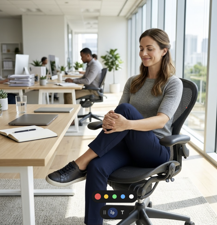 - 방법: 의자에 앉은 상태에서 양쪽 엉덩이에 강하게 힘을 주어 몸이 살짝 위로 들릴 정도로 조여줍니다. 5초 유지 후 힘을 뺍니다. 이를 업무 중 10회씩 반복하세요.
